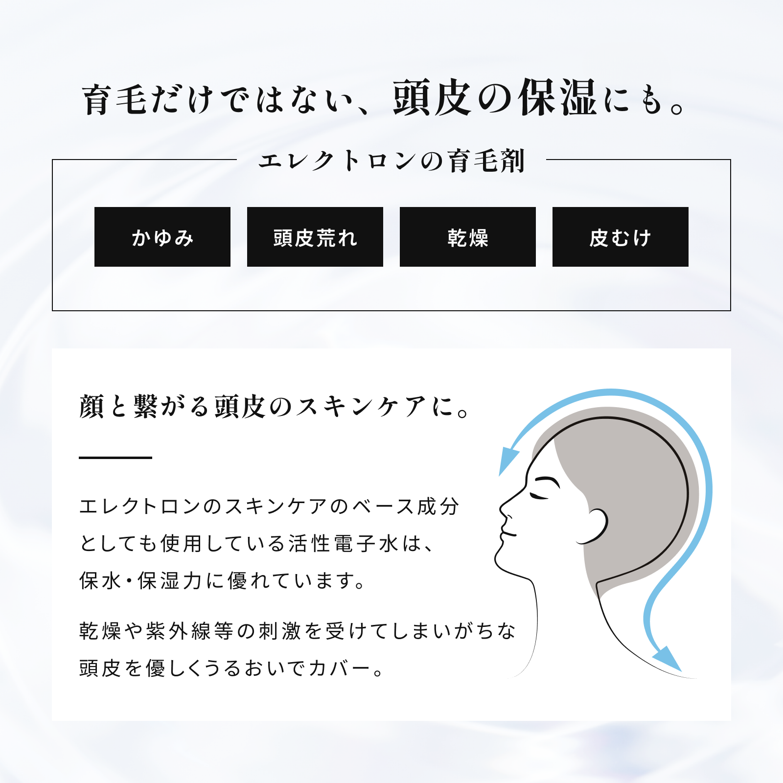 シャンプーと薬用育毛剤の2ステップ処方で基本のスカルプケア。将来や現在の頭皮に悩みがある男性に寄り添い、頭皮環境・皮脂バランスへ着目し、ニオイの元となる皮脂を除去します。